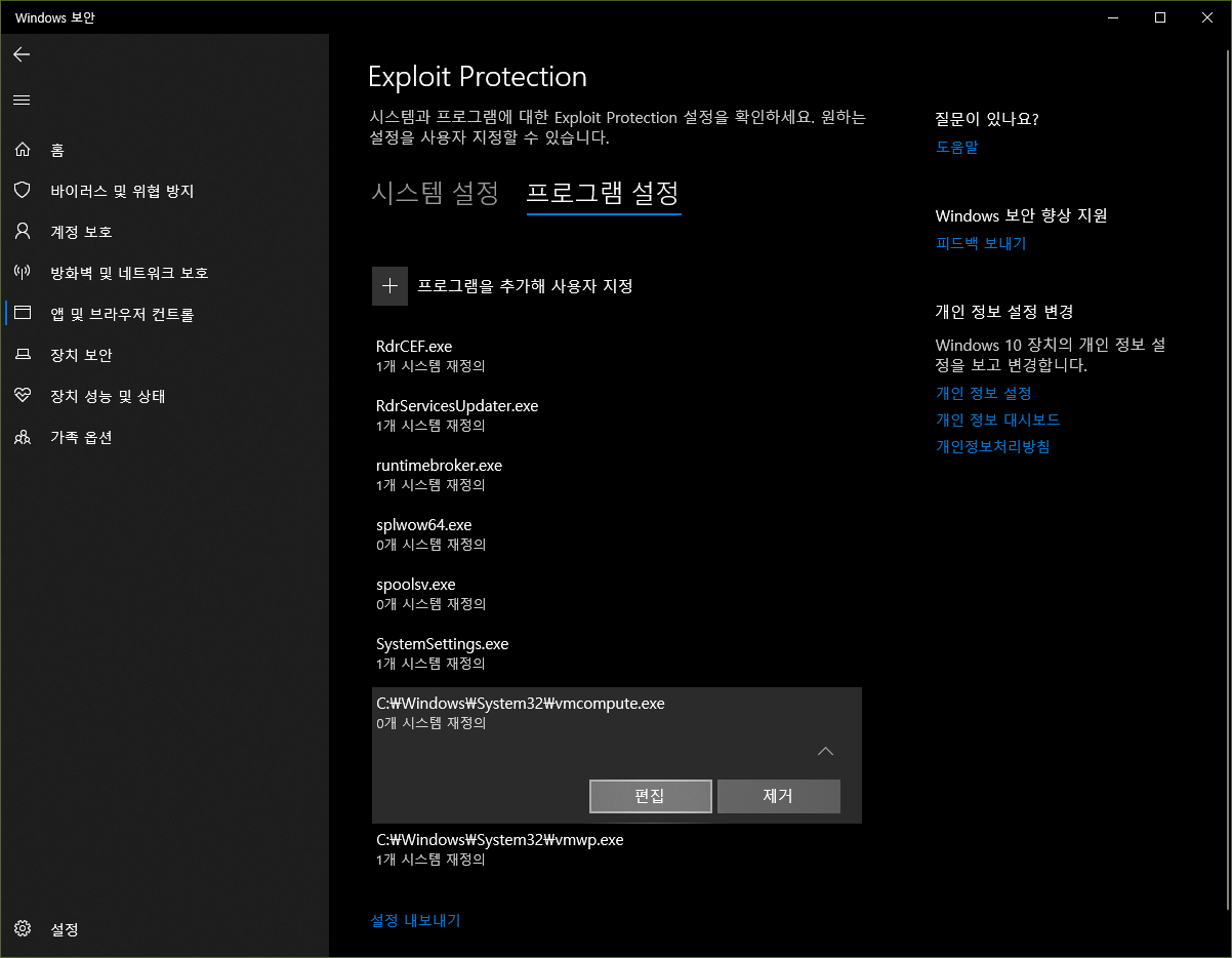시작 -> Windows 보안 -> vmcompute.exe 편집 -> 흐름 제어 보호(CFG) Off