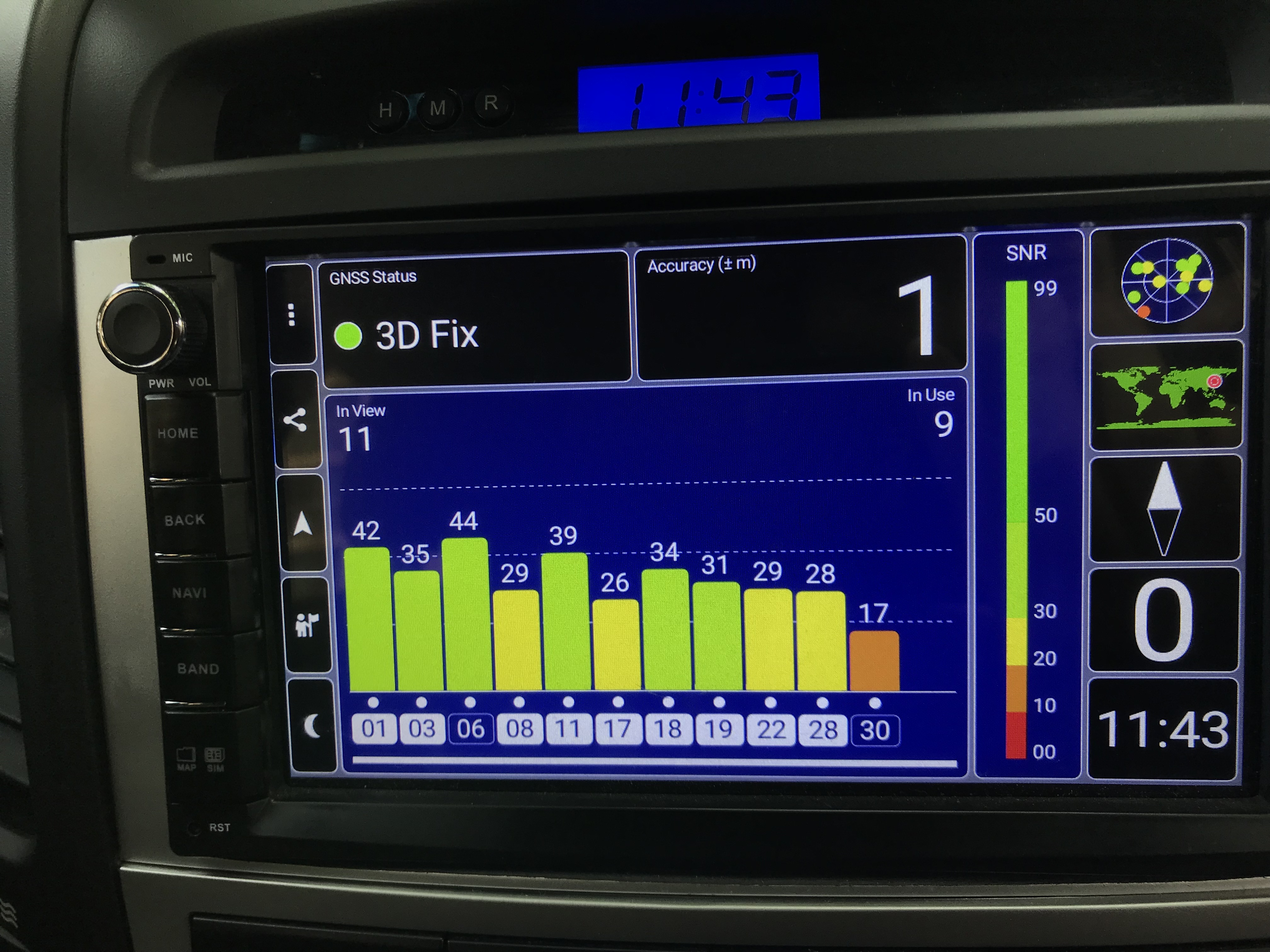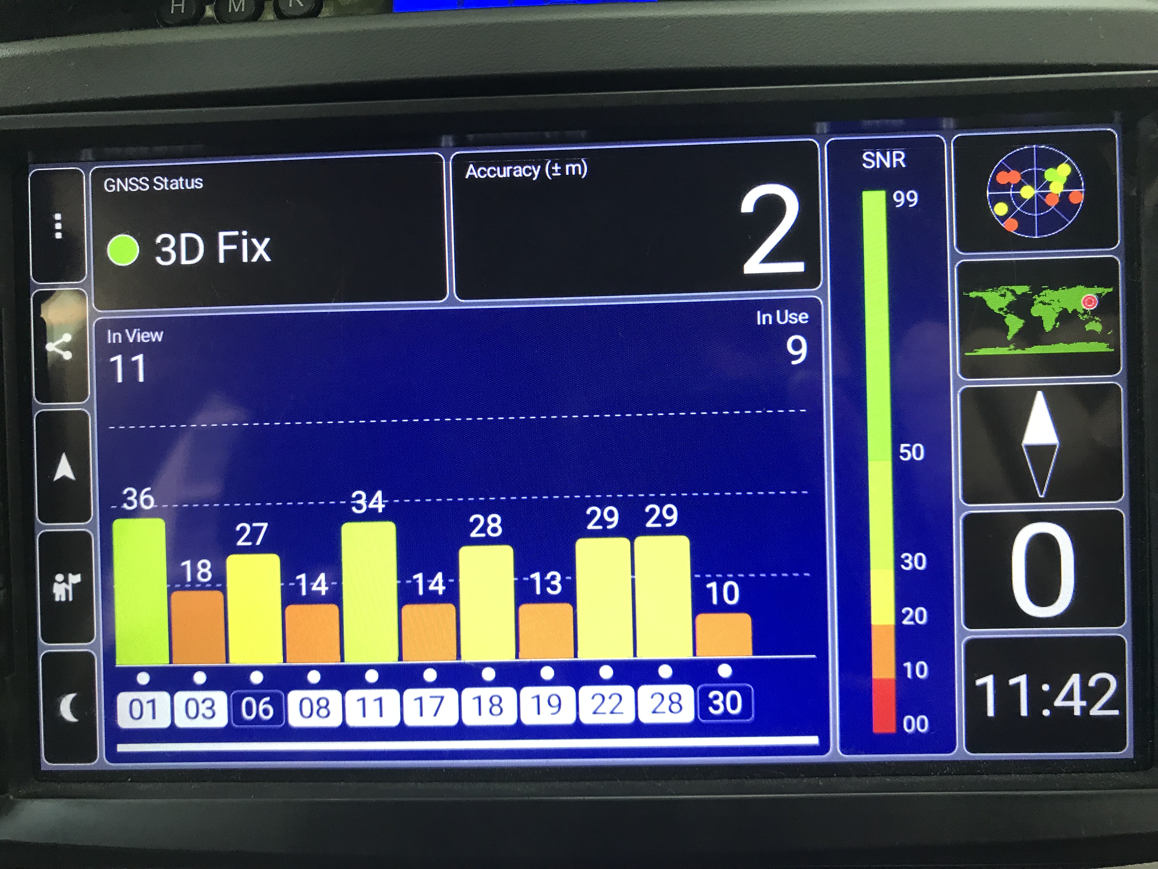 차량내에서 안드로이드의 GPS Test라는 앱을 통해 확인한 결과이다.