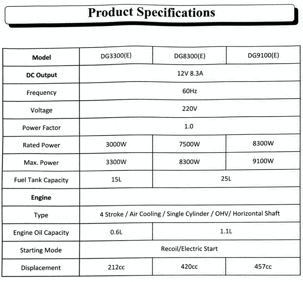DG8300/DG9100 오일은 약 1.1L가 들어가며, DG3300은 0.6L 오일이 들어간다.