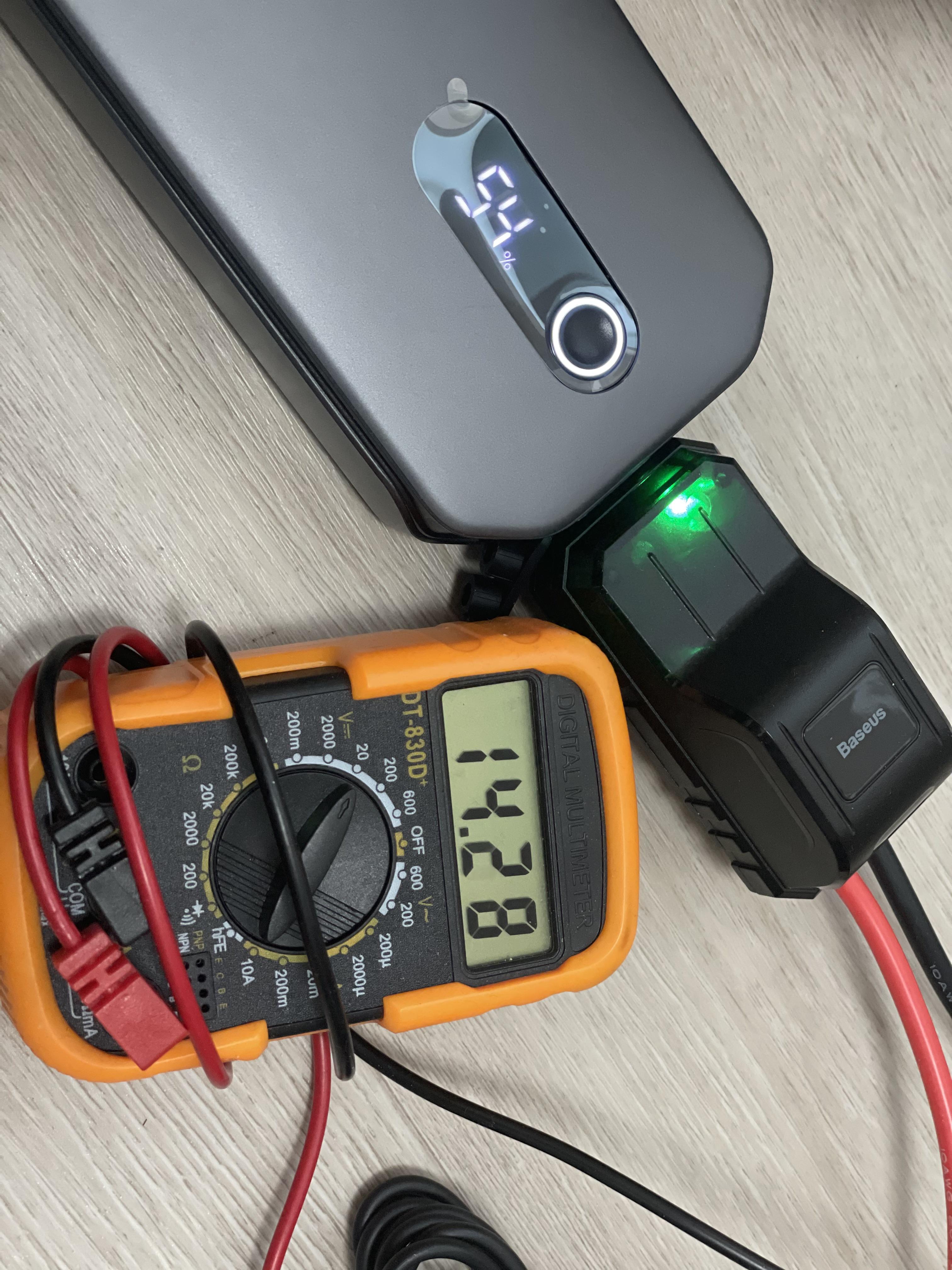 전압을 측정하면 약 14V정도 나오는데, 실제 배터리 연결하면 12V정도로 내려간다. 아무 저항이 없어서 높게 나오는편.