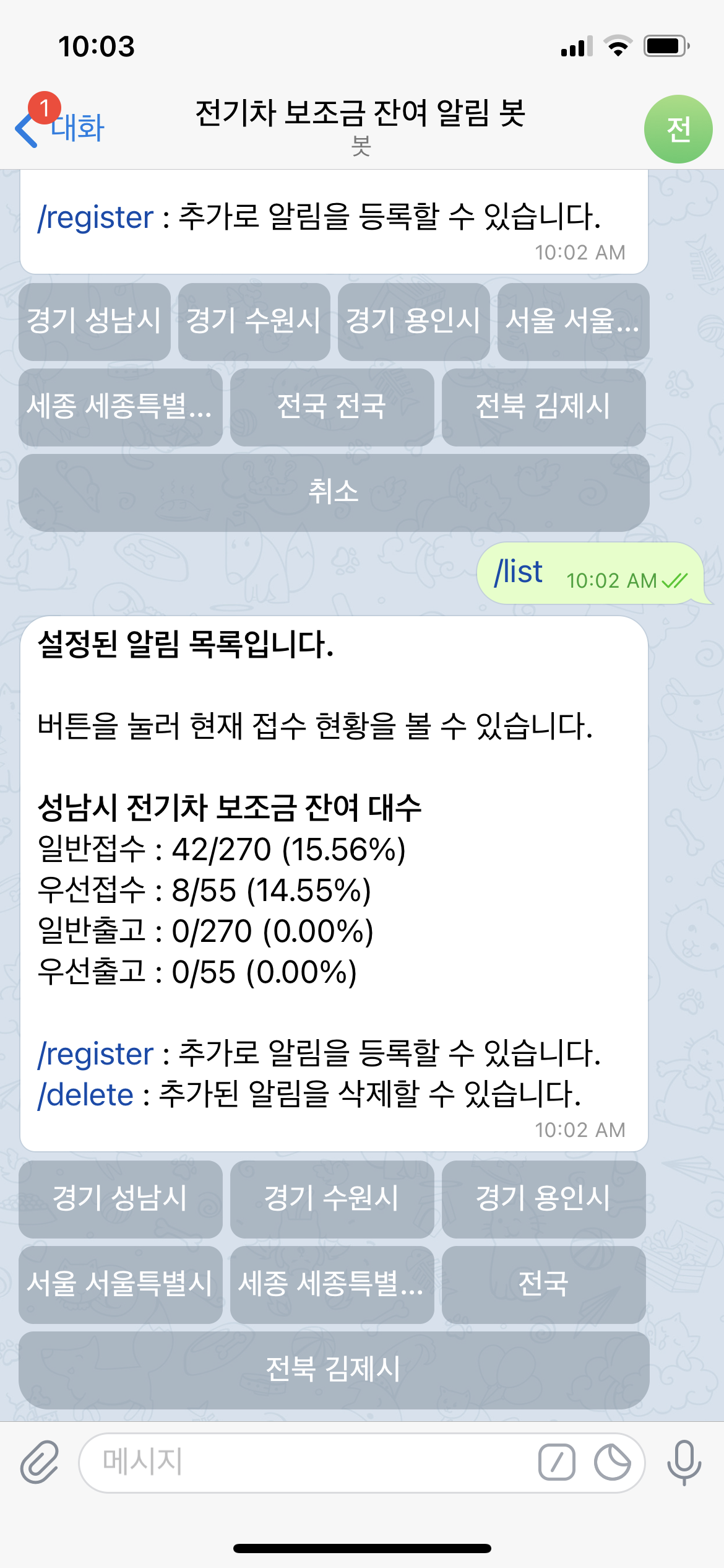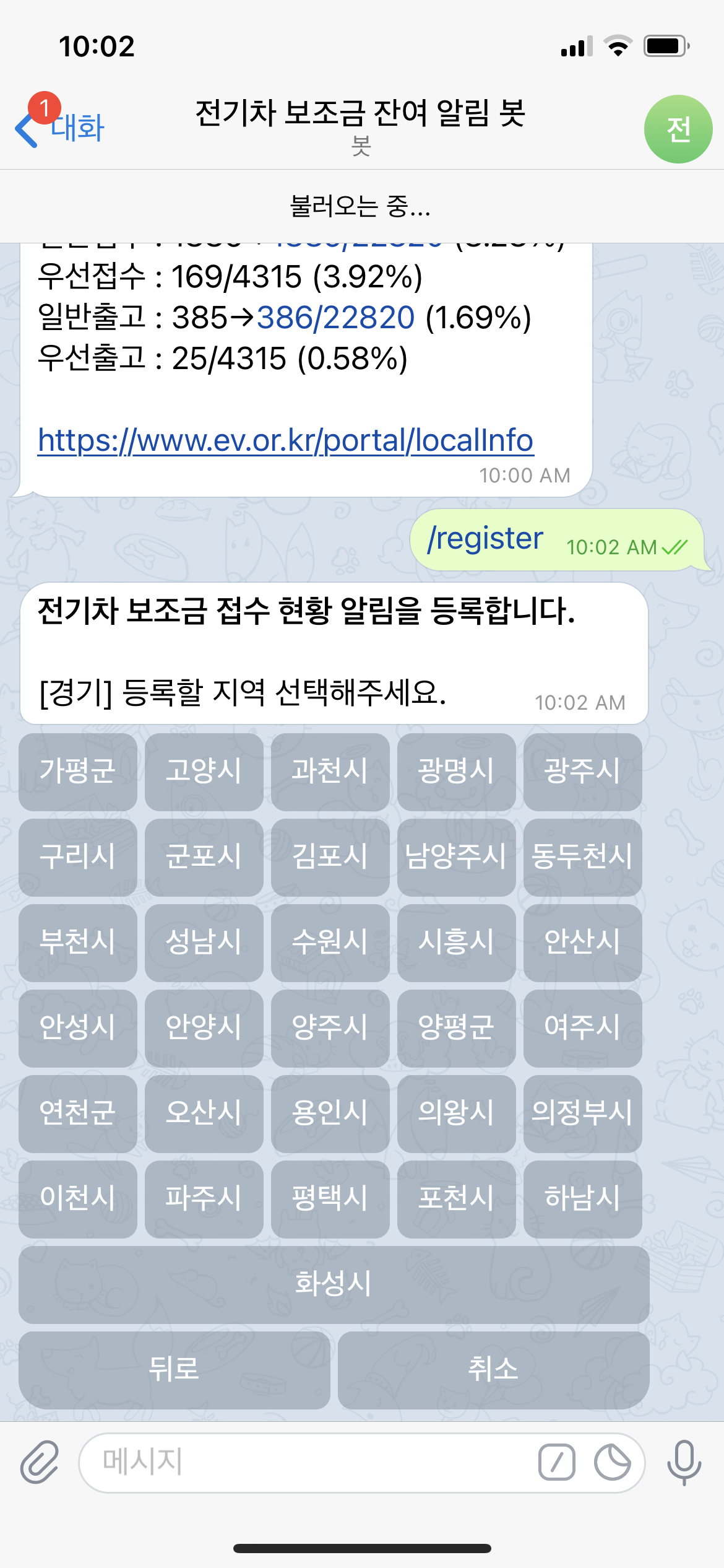 승용 전기차 보조금 접수/출고 대수가 변경되면 선택해둔 지자체별로 알림이 올 수 있도록 하였다.