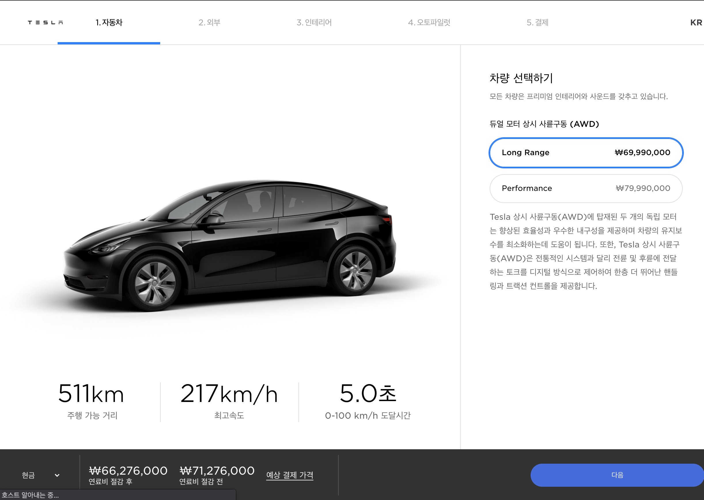 이제 옵션을 고른다. 옵션은 몇가지가 없어서 쉽다. 먼저 성능과 거리에 영향을 주는 롱레인지, 퍼포먼스, 스탠다드 등을 고른다. 보통 스탠다드는 후륜이고 배터리가 작아서 주행 거리가 짧다. 롱레인지는 거리에 특화되어 가격은 더 비싸지만 더 많이 주행한다.