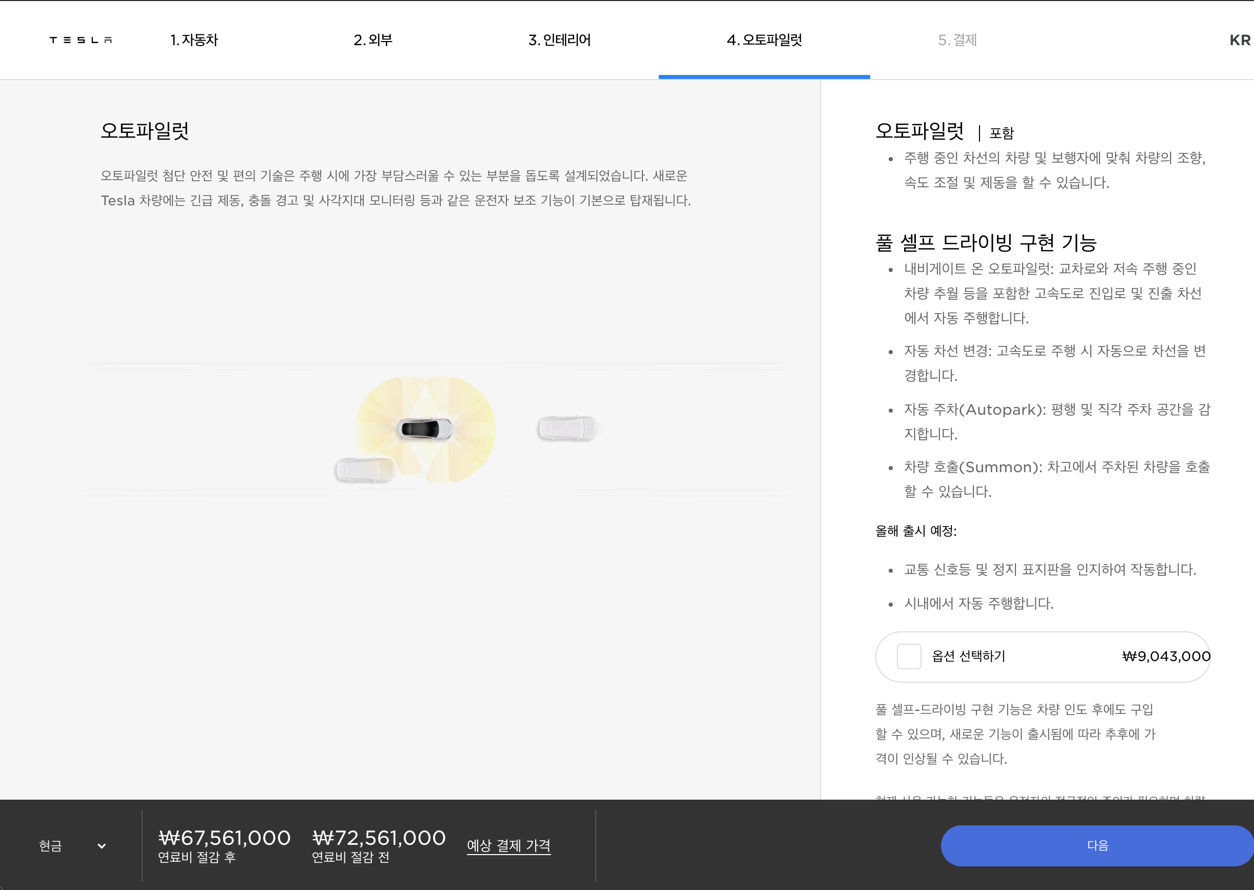 FSD는 보통 차량 인도 후에 넣기를 추천하는데, 이유는 주문할 때 넣으면 차량 등록시 차값에 포함된걸로 보아 더 많은 세금을 낸다.