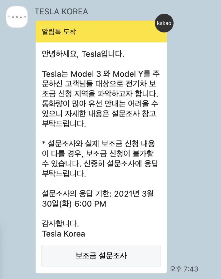 3월 25일 Tesla에서 카카오톡으로 보조금 설문조사 메시지를 발송했다.