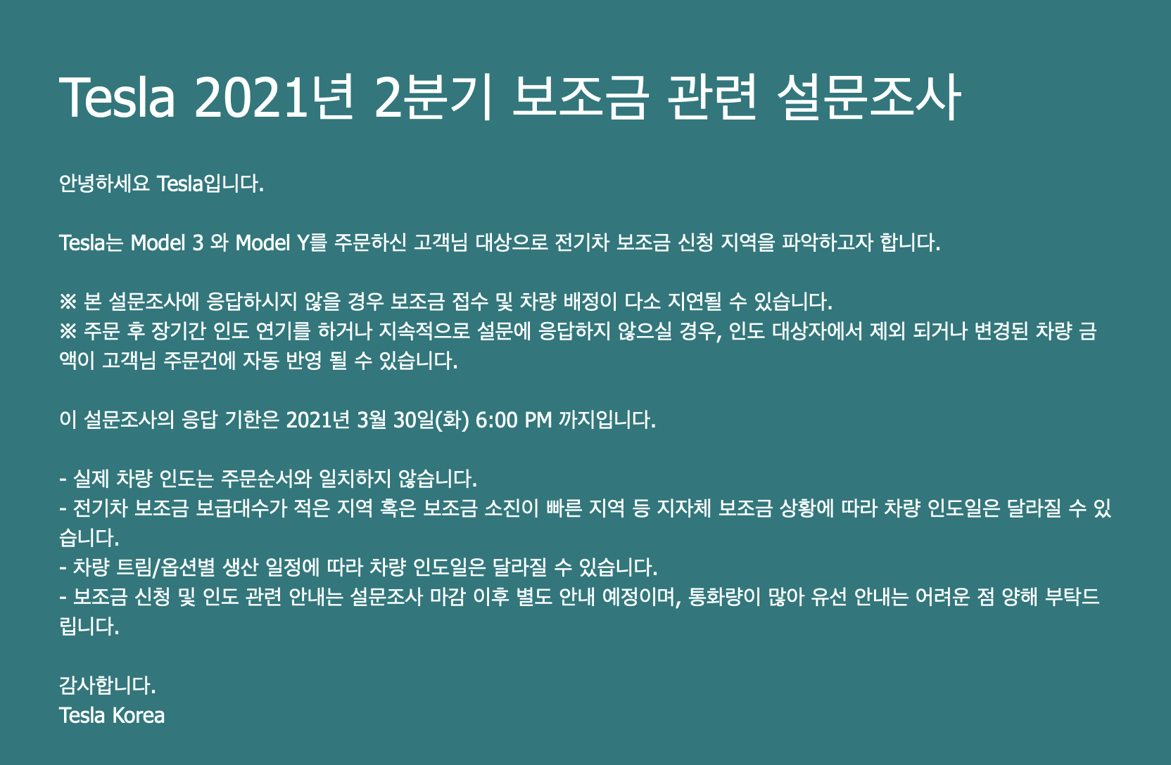 Tesla 2021년 2분기 보조금 관련 설문조사