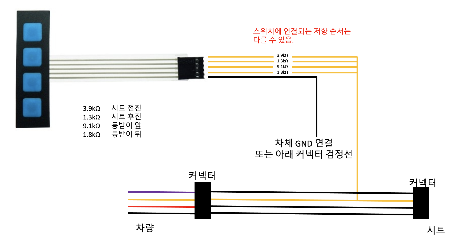 공통선을 GND로, 4개의 전선에 각각 저항을 연결하고 한가닦으로 묶은 다음, 조수석 시트 커넥터의 노란 배선에 연결해주면된다.