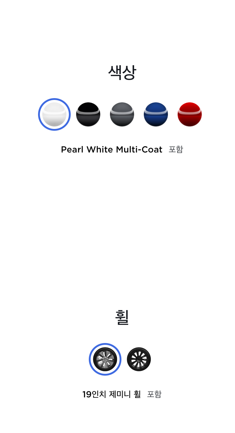 차량 색상과 휠, 내부 색상을 선택합니다. 향상된 오토파일럿과 풀 셀프 드라이빙 구현 기능은 차량 출고후 추가할 수 있습니다.