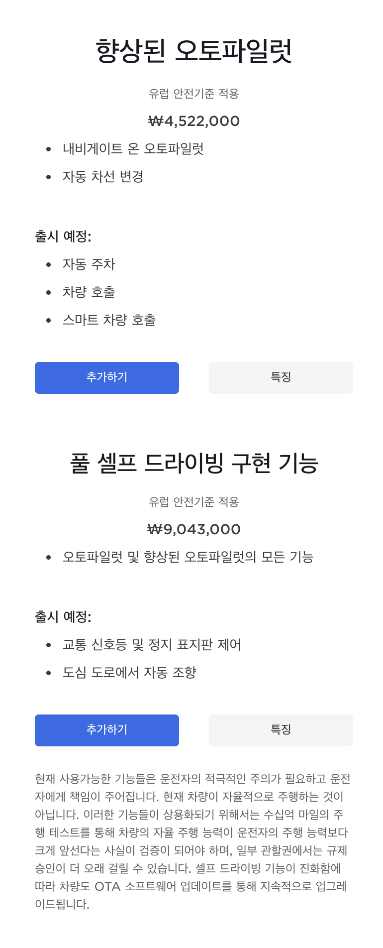 - 향상된 오토 파일럿(EAP)와 풀 셀프 드라이빙 구현 기능(FSD)는 추가해야 하나요?