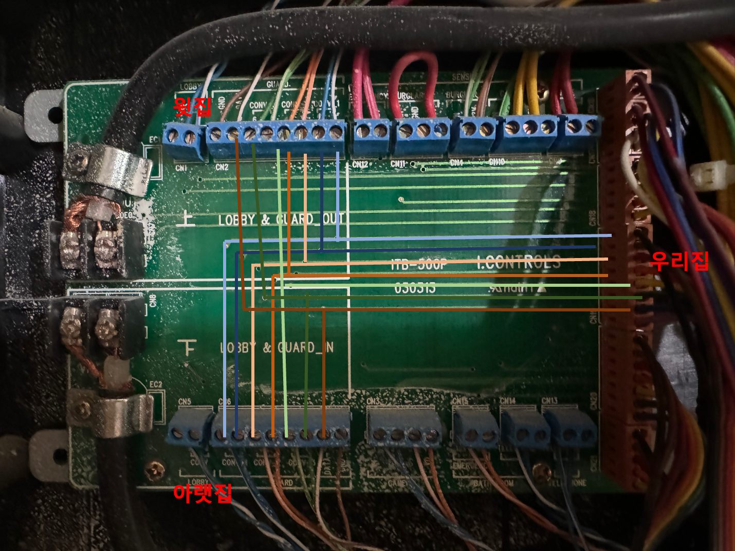 대충 이런형태로 경비실(통화1~3, DATA, GND)는 위/아래가 연결되어 있으니, 보드에서 나와서 인터폰으로 들어가는 배선에서 직접 연결해주는게 편하다. 보드에서 선을 빼서 연결하면 힘들고, 특히 UTP 선이고 얇아서 단선도 쉬우니 보드에서 나와서 인터폰으로 들어가는 선을 잘라서 연결한다.